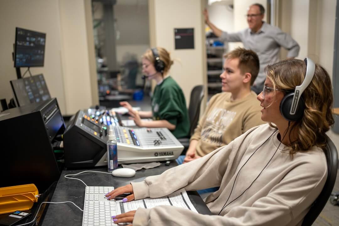 Students work through a live newscast as instructor Scott Libin (background) observes during a journalism class at the University of Minnesota. (Courtesy: Regina McCombs/University of Minnesota)