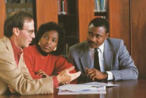 (L-R) Roy Peter Clark, Karen Cherry and Stephen Buckley talk in the Poynter library, circa 1989. Buckley, who now teaches at Duke University, is co-chairing the steering committee seeking to raise money for the new Roy Peter Clark Chair for Writing and Editing. (Poynter files).